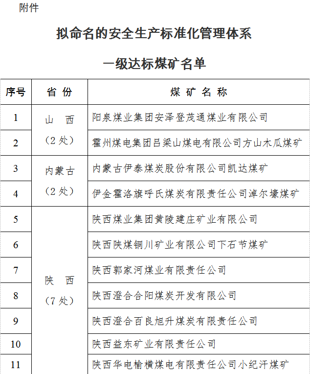 按照国家煤矿安监局印发的《煤矿安全生产标准化管理体系考核定级办法(试行)》和《煤矿安全生产标准化管理体系基本要求及评分方法(试行)》(煤安监行管〔2020〕16号)的有关规定,经资料审查和现场检查考核,现有11处煤矿达到安全生产标准化管理体系一级标准,现予以公示,接受社会监督。公示期间,如发现申报煤矿存在瞒报事故、弄虚作假等违法违规行为的,将依规定取消其申报资格。