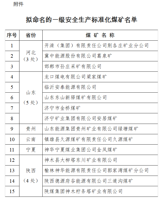 国家煤矿安监局公示拟命名一级安全生产标准化煤矿共15处