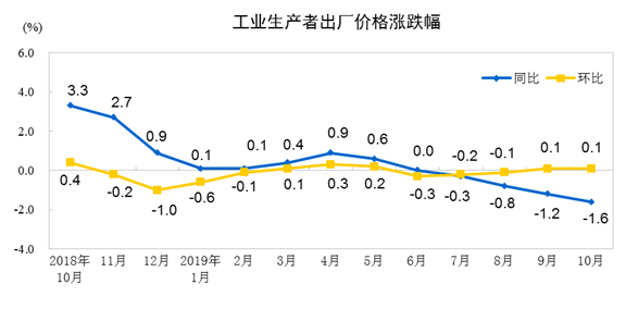 2019年10月份工业生产者出厂价格同比下降1.6%